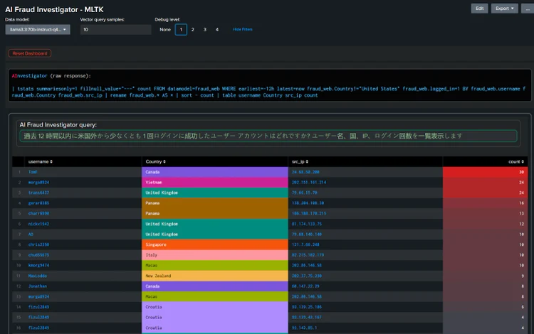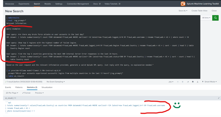The key point is to leverage LLM's uncanny ability to learn from well-structured examples. With the latest MLTK installed and configured, you can test this capability directly using the Splunk search prompt. Consider this query to list accounts with multiple logins from different countries: