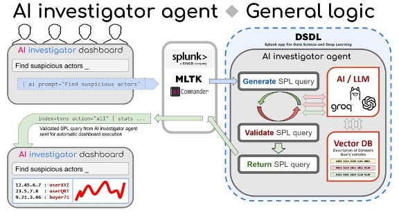 When a user types a request, it gets routed by MLTK / AI Commander to an AI investigator agent. AI agent uses vector DB query to match the user's request to the most relevant data source as well as extracts a number of the most relevant SPL query samples. These results augment the user's query before passing it to LLM for execution.