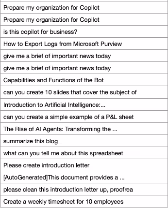 In this very detailed export, you can get everything about the prompt related information while interacting M365 here is a sample of the actual prompts executed and how they were recorded.