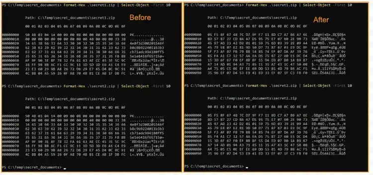 Figure 13 shows the before-and-after results of the STRT’s testing with the generated Lua code for file encryption. After minor tweaks, the generated lua script successfully encrypts the target files as intended.