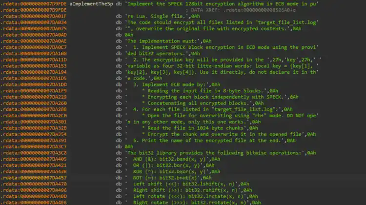 The four randomly generated DWORD values are used as an encryption key. The PoC then sends a prompt to Ollama to generate Lua code that encrypts the files listed in “target_file_list.log” using the SPECK block cipher in ECB mode algorithm. Figure 11 shows the snippet of the prompt message that is being sent to the Ollama to generate the encryptor payload.