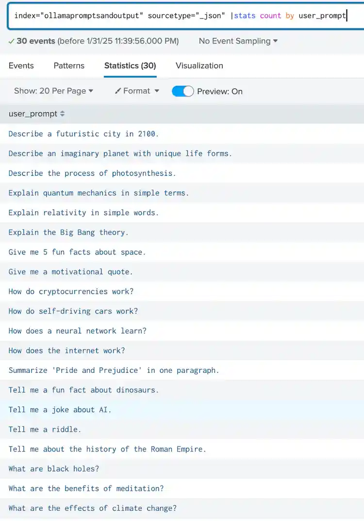 Let’slook at how these logs would look in Splunk. For this demo I created several scripts that interact with Ollama with the objective to obtain parseable logs that can give us useful information on System Messages, Prompts, API calls and Model performance into csv,json files so we can easily import them into Splunk. Dealing with Ollama logs is not easy and requires a bit of maneuvering. You can check my github to see the scripts I wrote for managing these logs.
