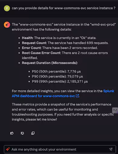 This is where the AI Assistant in Splunk Observability Cloud steps in to save the day! It explains the system, breaks down the application, outlines request/response workflows, and maps out the entire transaction flow. As a result, not only does the new person get to know the system inside out, but they might even bring up some interesting insights in meetings—stuff no one else knew, except for AI!