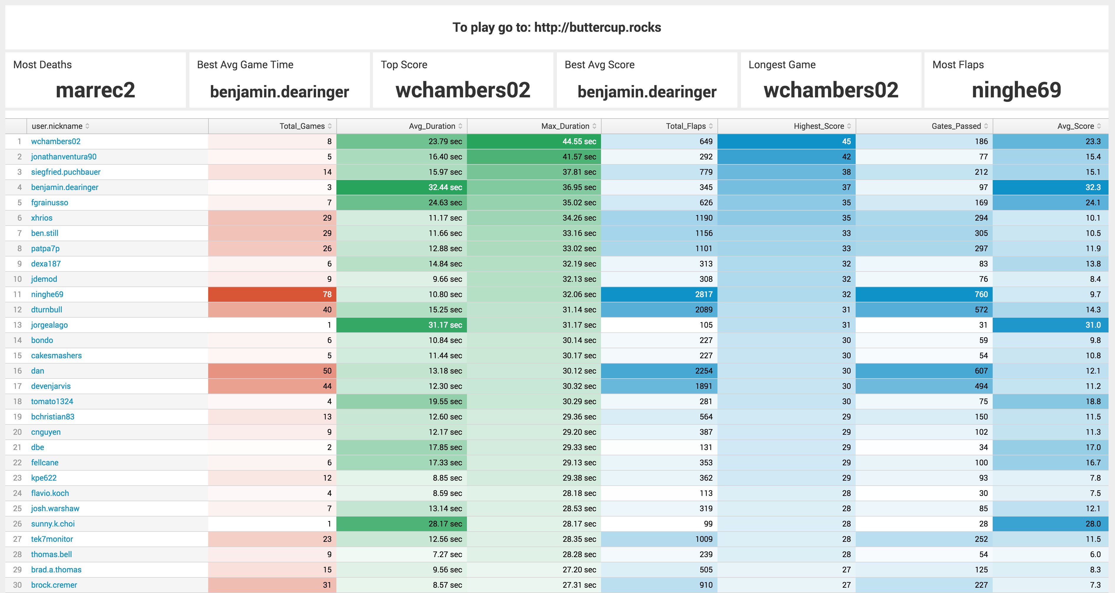 Are you ready to give it a go? Simply go to https://buttercup.rocks and you can play, right now. If you do it during this week your name could be on scoreboards around the conference. Here is a screenshot of the top scores during the keynote. These users will go down in history as the first to play and the first to lead the scoreboard. Bonus, click on the speaker icon in the top right after logging in to enable sound!
