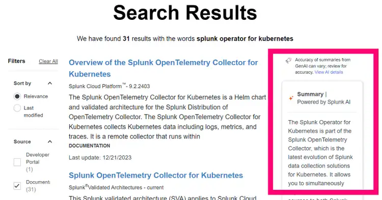 This great new federated search feature isn't only available on Splunk Lantern. Results from select content sites are also at your fingertips when you run a search on Splunk Docs, Splunk.com, and the Support Portal. On Splunk Docs, you'll even find AI-generated summaries of the key terms and concepts you're searching for, as well as top recommended articles. And if Splunk AI is missing the mark, you can let us know by clicking the thumbs or thumbs down below the summary so we can keep improving our offerings to better get you the information you need.