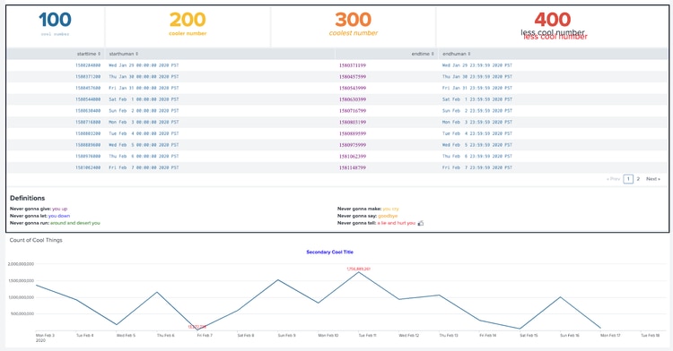 Here is the dashboard that I’ve created. It’s all randomly generated data that has literally no meaning. As you can see, it contains lots of colors, the single value panels have different widths, there’s a border. There are a lot of possibilities within Splunk dashboards to customize them when using CSS.