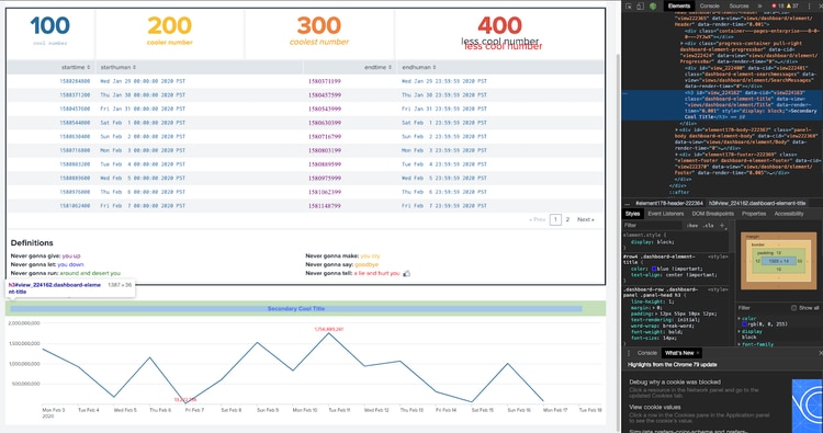 So let’s get into how to use the Developer Tools to figure out what the element is even called that you want to edit. In the top left corner of the Developer Tools you can click on the little mouse icon to hover around the dashboard and click on an element and it will take you right to where you need to go in the code. As you can see in the image below, I’m hovered over “Secondary Cool Title” and the class name is called “dashboard-element-title”. One thing to remember is that element IDs are notated with # (hash) and classes are notated with . (dot). There are more selectors that can be used, if needed. That’s all I really need to know here. I have an ID attached to this row, so the class is all I need to start editing the title.