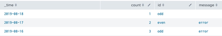 | gentimes start=-3 | eval _time = starttime | fields _time | sort - _time | streamstats count | eval id = if(count%2=0, "even", "odd"), message = case(count>1, "error")