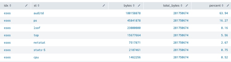 This example shows us that a new column is created called total_bytes with the eventstats command and sums all data from the bytes field grouped by the idx field. This helps us evaluate the percentage of bytes each sourcetype (st) is indexing in each index during our timerange.