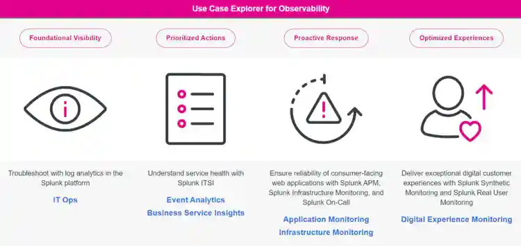 In the Use Case Explorer for Observability, Foundational Visibility starts with a large number of log analytics use cases that our Splunk Platform customers can start implementing right away. By adding on Splunk IT Service Intelligence, you move to the Prioritized Actions stage of observability resilience for mission-critical event analytics and business service insights. As a Splunk Observability Cloud customer, you'll be empowered to deliver Proactive Response for better infrastructure monitoring and troubleshooting. Finally, in the Optimized Experiences stage, you'll focus on creating customer experiences that are seamless and high quality across all touch points.