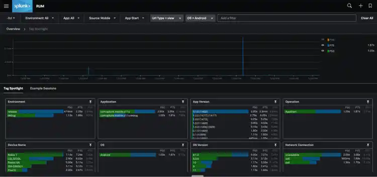 Workflow Two: Identifying the Blast Radius of an Issue If you hear that the new release of your app is slow, you can quickly go into mobile rum to see the distribution of your app startup time across all your user sessions. Splunk RUM provides out of the box breakdowns of app version, OS, OS version, and device. Now you can quickly isolate app startup issues across a specific device and OS like Nokia1 running Android 7.1, and prioritize the issue appropriately.
