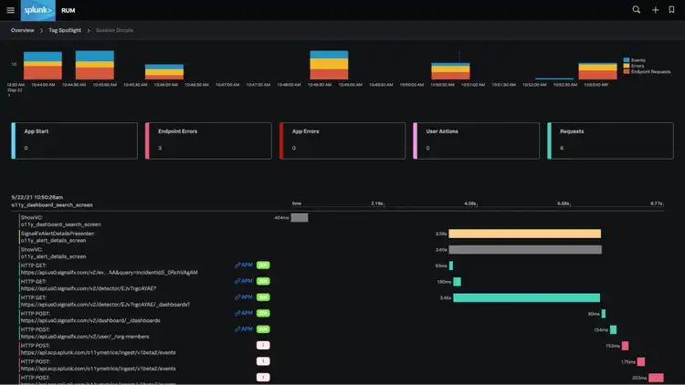 Splunk’s Mobile RUM quickly shows performance across your entire stack, from crashes and mobile performance on the client side, to errors or latency from database calls in your backend services. Within Splunk’s Observability platform, it helps you analyze and improve user-experience in context across your entire environment.