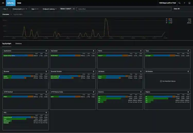 This takes us to Tag Spotlight, where we can see which tags and dimensions are correlated with high latency values for /cart/*. Percentiles (p50, p90, p99) help quantify how many user sessions are affected by the slow endpoint, and are shown alongside dimensional information about your user sessions including cities, countries, web browsers, devices types, and information about HTTP calls sent or received. You can click any of the tag values to easily apply filters on the data, and understand what kinds of users are affected.