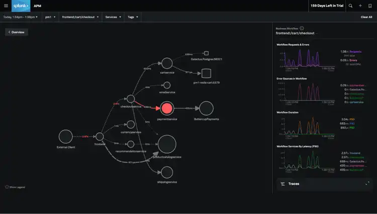Clicking into “Workflow Name” provides a service map, where we can visualize latency across different components and services in our backend architecture. Very clearly, we can see that the slowness is correlated with errors on the ‘paymentservice’.