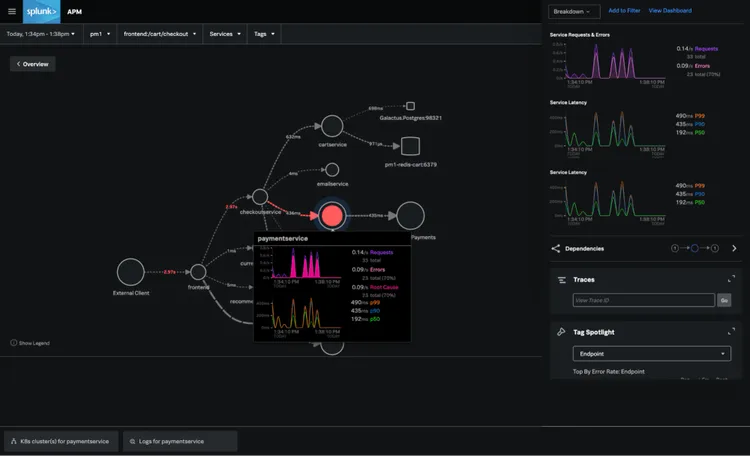 For general troubleshooting, Splunk’s near infinite cardinality helps you quickly correlate issues to find root cause faster, even across complex distributed systems with hundreds of dependencies. Easily view general end user experience (RUM’s overview page), dig deeper into errors and latency in end-to-end traces (APM and RUM), and sort through individual logs in Splunk Log Observer.