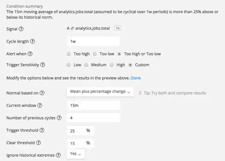 Choosing to Alert when the value is Too low and a value of 25% for Trigger threshold, for example, will alert when the 15-minute rolling mean is at least 25% smaller than the median of the historical means. Choosing Too high alerts when at least 25% larger, and Too high or Too low (our choice) alerts when at least 25% larger or smaller.