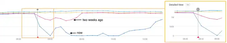 In this chart, we can see the drop in the metric (the blue plot on the bottom) and the red triangle indicating an alert was triggered. Coincidentally, around the same time two weeks ago, the metric experienced a substantial, but less drastic, drop (the pink plot).