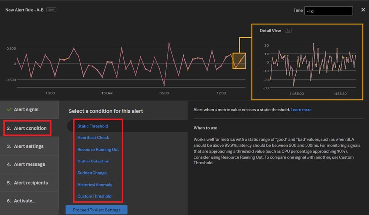 With the right metric calculation in place, the next thing to set is the Alert Condition. This is how we evaluate the criteria and thresholds we want to apply to the metrics we’ve gathered in the Alert Signal component. These conditions greatly simplify the use of Machine Learning (ML) to accurately identify anomalies and deviations. In this example, we’ll be using a simple Static Threshold, but there are numerous Alert Conditions available to select from within the platform.