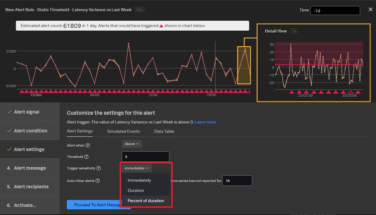 Now, we’d specify that we only want to fire an alert if our latency exceeds the threshold for at least half (50%) of a five-minute window. Accommodating for a spiky dataset and customising the threshold to look for a trend brings the number of simulated alerts over the previous day down from over 61,000, to just one. Our customisation has made what would have been an unusable detector into something valuable and meaningful for the team!