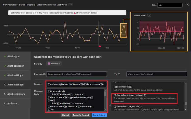 From the alert message customisation pane, we can pull through any of the dimensions from the signals we’ve configured into the alert message. The customisation options are quite comprehensive and even allow for conditional statements and URLs/images to be embedded into the alert message. We’d simply identify the variable we want to include in the message body and subject - {{dimensions.demo_customer}}, and, with a simple change, we’ve made the alert significantly more actionable.