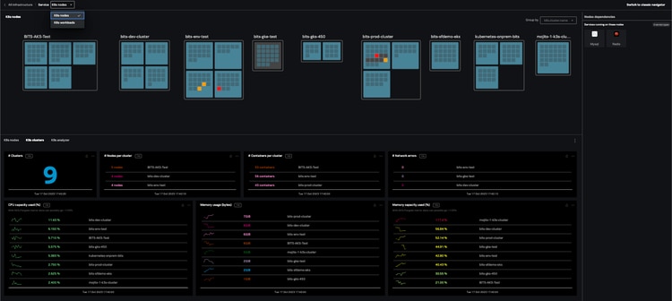 Once you have deployed OpenTelemetry to instrument data collection from your Kubernetes services and applications you will see all of your Golden Signals for your K8s deployment by simply clicking on the Kubernetes navigator tab in the same top-level infrastructure view as your cloud metrics. Not only will this give you a standardized, out-of-the-box view of metrics for nodes, containers, and clusters, but you can also filter by workload to see what is running in your environment. The K8s Analyzer tab also provides guided suggestions on where to drill down further based on possible performance degradations that are identified.