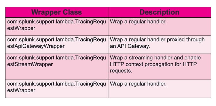 You also have the option to add the wrapper as a dependency to the Lambda function. A Splunk Lambda wrapper wraps around an existing AWS Lambda Java function handler. This approach doesn't require any code changes to your Lambda function. When you deploy the Lambda wrapper with a Lambda handler, you add it as a dependency to your Lambda function. Whenever the Lambda function is invoked, it runs the Lambda wrapper which in turn calls your code. You can find more information about how to deploy via this method in Github.