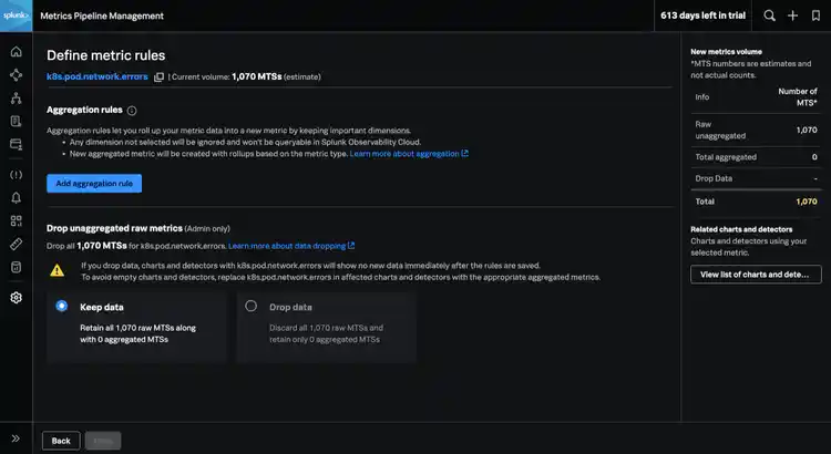 With aggregation rules, you’ll be able to consolidate the high cardinality metrics data you select into new metrics that require less storage and improve computational performance. Engineering teams will continue to have access to their familiar workflows, detectors, and charts within Infrastructure Monitoring after ingesting only the vital data. You’ll have the flexibility to scale observability to more environments and distributed teams even as you control usage and costs.