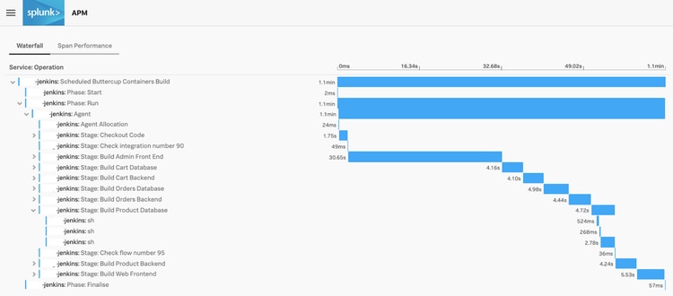 Tracing and APM for Jenkins recently became much more straightforward with the advent of the OpenTelemetry project and an OpenTelemetry Jenkins Plugin (Maintained by Cyrille Le Clerc). Once configured, a single click can take you from your Jenkins job into a detailed waterfall chart of the entire pipeline run!