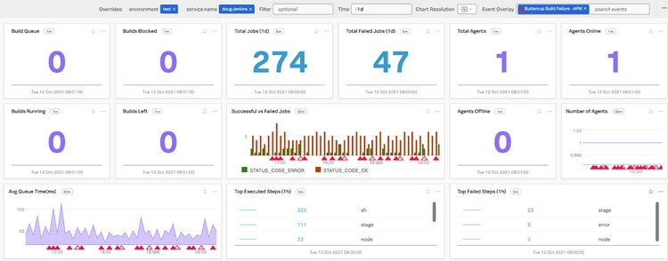 - Deployment Frequency: How often are you deploying your code with Jenkins? Chances are, that with a bit of effort, you can dig up and report on this data already. But, imagine a dashboard per org, team, or service showing this number in a single chart by leveraging APM or Log Observer data emitted from Jenkins.