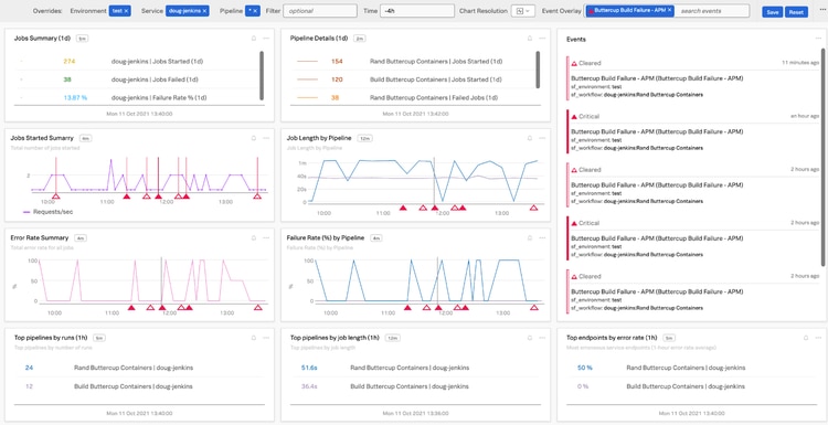 - Mean Lead Time for Changes: Knowing when you’re deploying is a crucial element of establishing the overall development time required to get a change from ticket inception to final deployment into production. Using your new Jenkins data in Observability Cloud along with some additional signals from other software like Jira and Github, you’re well on your way to establishing a trackable flow from ticket, to development, and on to deployment.