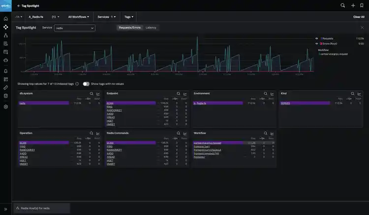 The SRE then uses tag spotlight and finds that Cartservice:grpc.request has 113,000 requests per second, and scope the additional impact of the problem across their workflows.