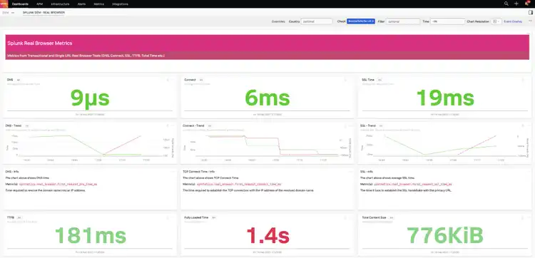Splunk Cloud and Enterprise users now have visibility into Digital Experience Monitoring and their end-user experience. Metrics from Real Browser, Uptime, and API tests are now streamed to Splunk Cloud and Enterprise via the Synthetics HEC integration. These metrics provide IT Ops teams critical information about how pages and API endpoints respond to end-user transactions. Some metrics include: Response time, Time to First Byte, and DNS time along with 50+ performance metrics and custom user timings for Browser-based transactions.