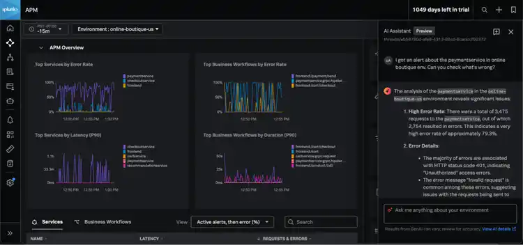 Meet AI Assistant in Observability Cloud, a new Splunk in-product chat experience powered by GenAI in which you can use natural language to detect, investigate, and respond to incidents in your environment. Using powerful domain-specific and in-context Large Language Models (LLMs), the AI Assistant allows engineers to ask questions to the chatbot directly in plain language and gain key insights about their systems faster, regardless of their level of experience in Splunk or observability, reducing their mean time to investigate (MTTI) detect (MTTD) and resolve (MTTR) incidents.