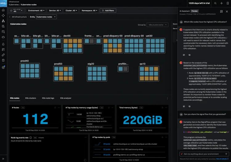 Thankfully, your engineering teams use Splunk Observability Cloud. All they have to do is type “Which K8s node has the highest memory utilization?” to find out in just a few minutes which node is experiencing memory utilization issues and may be contributing to the performance degradation. With AI Assistant, not only can you get more details about your production environment, but you’re also ensuring that your tech stack is always well-performing and optimized, for a more reliable operative system.