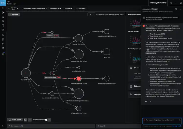 Enter AI Assistant in Observability Cloud. Simply type in “What’s wrong with my payment service?” in the chat and get immediate answers on why and where the application is failing.