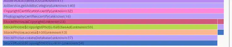 The most obvious case for excessive garbage collection activity is code allocating too much memory, or creating too many objects for which garbage collection must account. To visualize code bottlenecks we use flame graphs (for more details, see using flame graphs). The below flamegraph visually aggregates the 457k+ call stacks captured from our JVM when our code was allocating memory. The widths of stack frames, represented as bars on the chart, tell us how much each stack frame proportionally allocated memory.