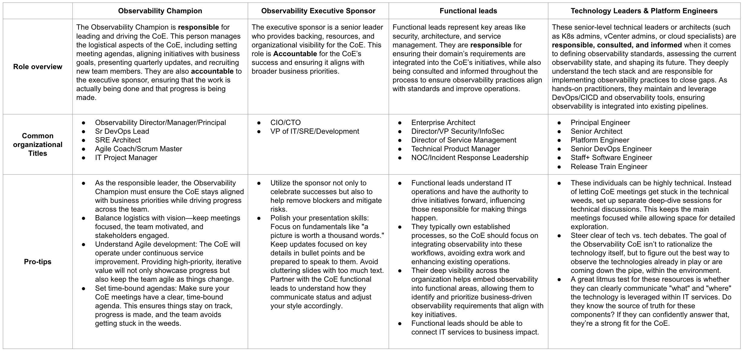 Next, let’s talk about the key people who need to be involved in your Observability CoE. Below is an overview of the various roles to consider, along with common titles and some "pro-tips" for each role as you build the CoE.