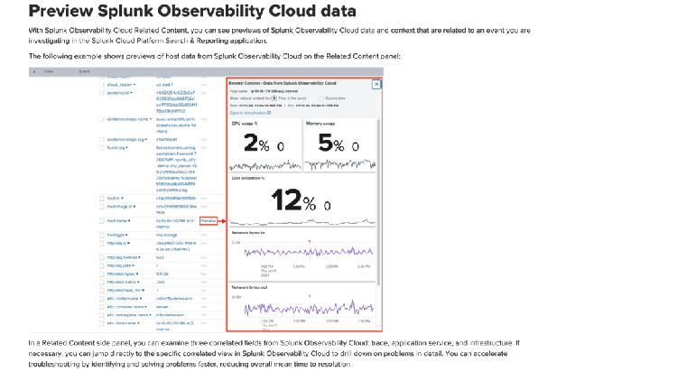 Figure 1-1. This displays images showing a preview of host, service and trace data from Splunk Observability Cloud in Splunk Enterprise in the Related Content panel.