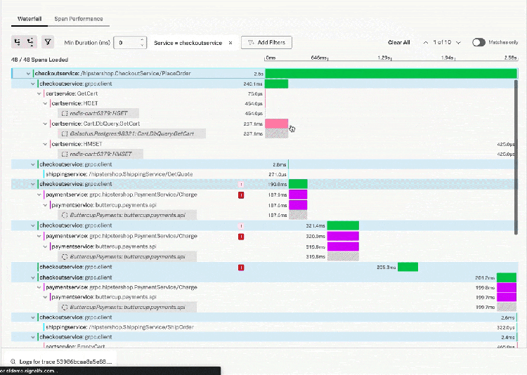 For example, we might want to filter on the order ID to find traces related to a particular order of interest: