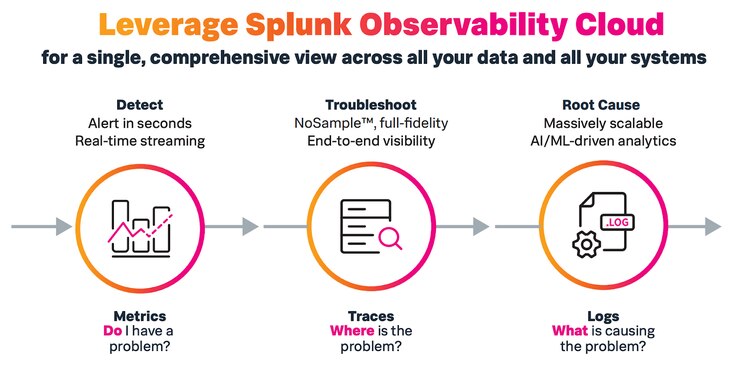 With Splunk Observability Cloud, not only do you have access to these three key pillars of data, but you also have access to real user monitoring and synthetic monitoring to identify issues occurring in user browsers, third-party JavaScript libraries or even public networks. Furthermore, our real-time streaming analytics detects incidents in mere seconds. There’s no risk that the broken traces might be missing data — we do not sample and instead ingest, analyze and store all trace data in full fidelity (see why sampling is a bad idea in observability). Once a problematic trace is identified, directed troubleshooting powered by AI and ML helps pinpoint the source of the problem and live service logs from the service, automatically analyzed for context, appear right away. Integration with Splunk On-Call gets the right person the first time, and they can seamlessly review any metric, trace or log in context to quickly find out exactly what happened, where and why. These actions combine to minimize MTTR — Splunk customers can go from issue detection to understanding the cause in under four minutes 90% of the time.