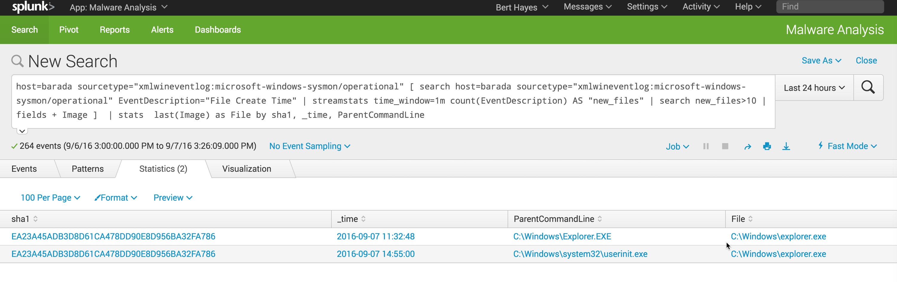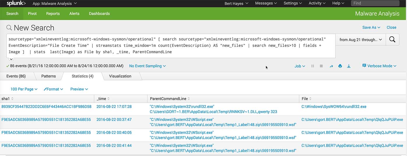 So, the search above returns events, and these events contain the full path to the process image (e.g. C:\Windows\Explorer.EXE) If we take the values for Image and feed them back into a Splunk search, we can find the SHA1 hash of the file that’s generating so many new files. We can also list the ParentCommandLine value and get a timestamp for this activity: