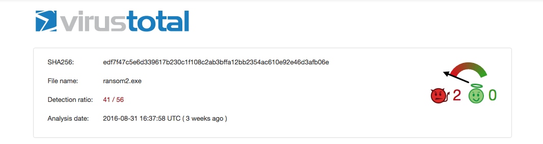 Clicking on “Virus Total Lookup” opens a new tab in my browser and takes me to the search results on virustotal.com. Yep, it’s ransomware.