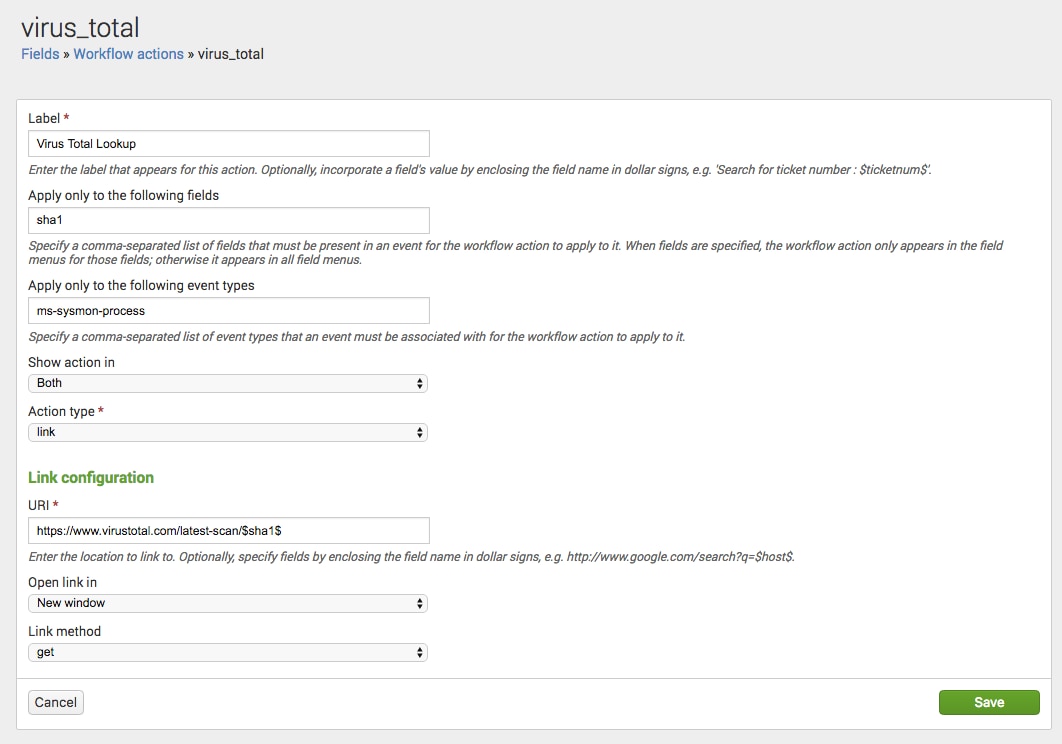 [virus_total] display_location = both eventtypes = ms-sysmon-process fields = sha1 label = Virus Total Lookup link.method = get link.target = blank link.uri = https://www.virustotal.com/latest-scan/$sha1$ type = link