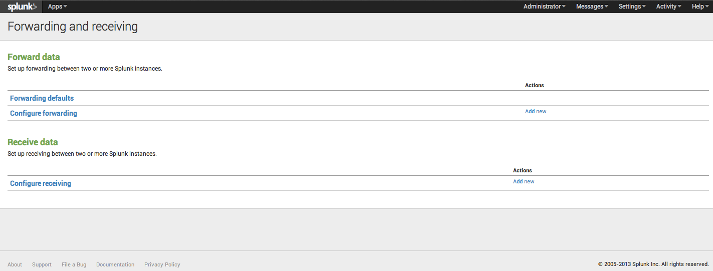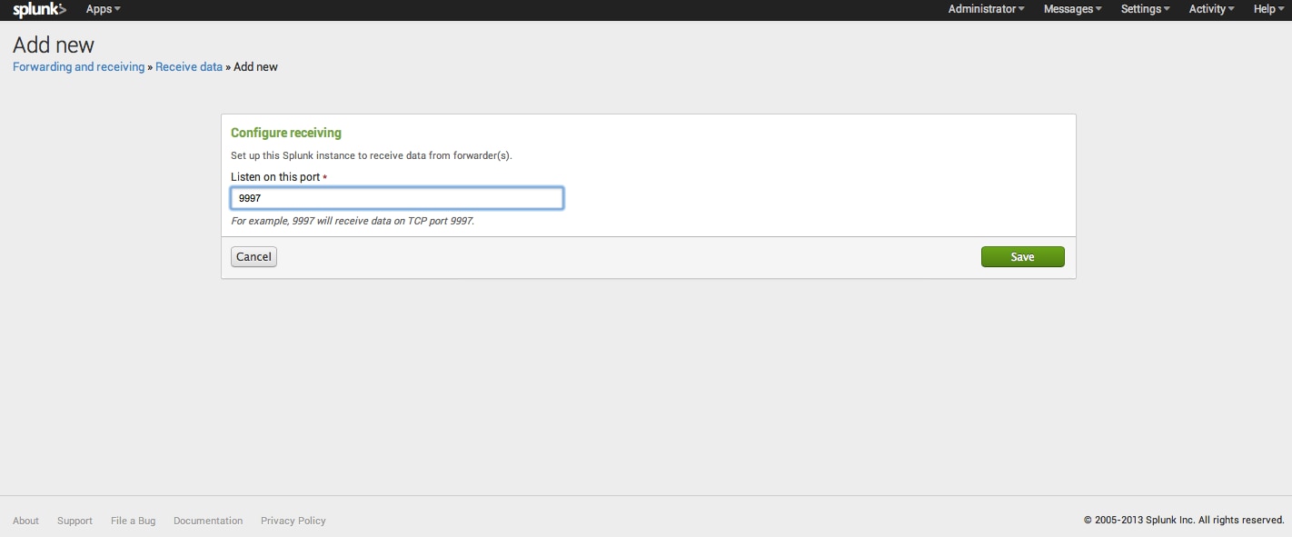 Click “configure receiving”, and you will be taken to the receive data configuration page. Assuming this is a brand new installation of Splunk, you will have no configurations. Click “New” and you will be taken to the new configuration wizard. For now, we will just add a new listener at port 9997, and click Save.
