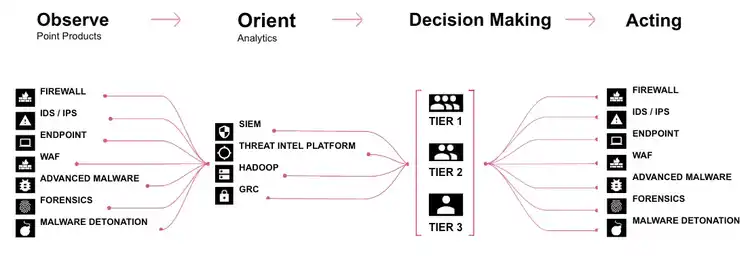 Analysts then need to make sense of those observations. Applying some level of analytics allows them to draw conclusions, identify trends and understand context. Alerts are typically generated in these first two phases — from point products in the observe stage and analytical tools in the orient stage.