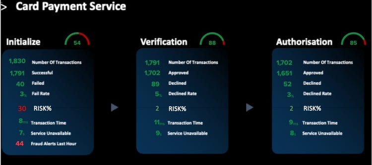 Another risk score that is just as relevant is one that monitors the stability of the business. Again, an example would show this more clearly. Suppose we had a credit card Glass Table that shows Key Performance Indicators (KPIs) for the business of credit card payments. A Glass Table is a Splunk concept of an image with KPIs next to any relevant place in the image. One of the Glass Tables’s KPI could be a risk score calculated based on fraud attempts. To show an example of this, I borrowed a Glass Table from Splunker Marc Serieys and added a risk score.