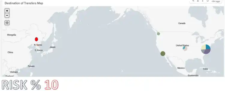 Up to this point, what we have shown are what I call “IT based risks”, which are very important, but they are part of operations and not necessarily something the outside world of the company enduring the risk would know. Risks that have to do with regulations are much more visible as governments would now be involved. For example, suppose sanctions are put against a country, and it is forbidden to perform wire transfers to this country. These are now government regulations that will go under outside scrutiny as auditors will want to have time series reports on where money was transferred. Using Splunk and tracking the destination of a wire transfer from the time series events generated by the application could produce something like this on a map.
