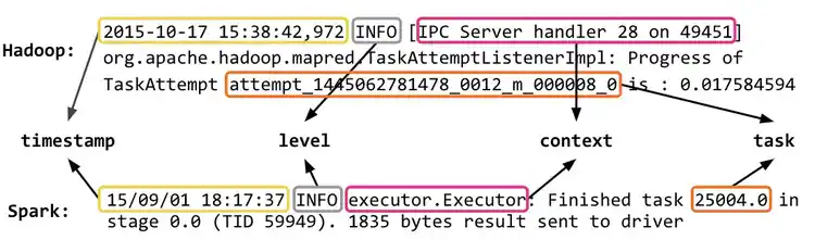 This can be attributed to the representation power of ML models, as well as the similarities in the logs generated by different applications. As an example, consider the similarities between Hadoop and Spark logs below:
