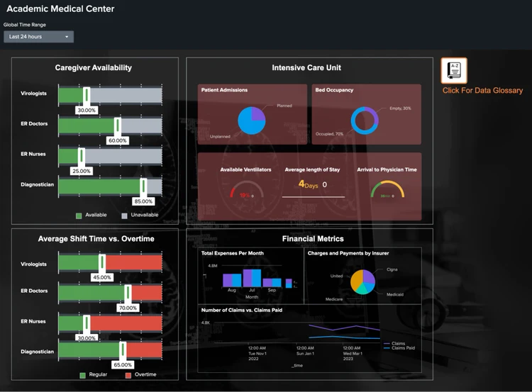 Because Splunk provides insights into real-time data sources like logs, metrics, events, and traces, Splunk dashboards can be used by nearly every leader to determine their current posture. Unlike static operational reports or historical reports, the real-time nature of these dashboards allows executives to be proactive, have greater visibility, reduce downtime and performance issues and save money and resources.