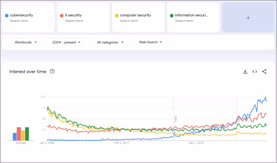 Google Trends indicating global interest in four search terms since 2004: cybersecurity, it security, computer security, and information security. (Image from Novemver 2024.)